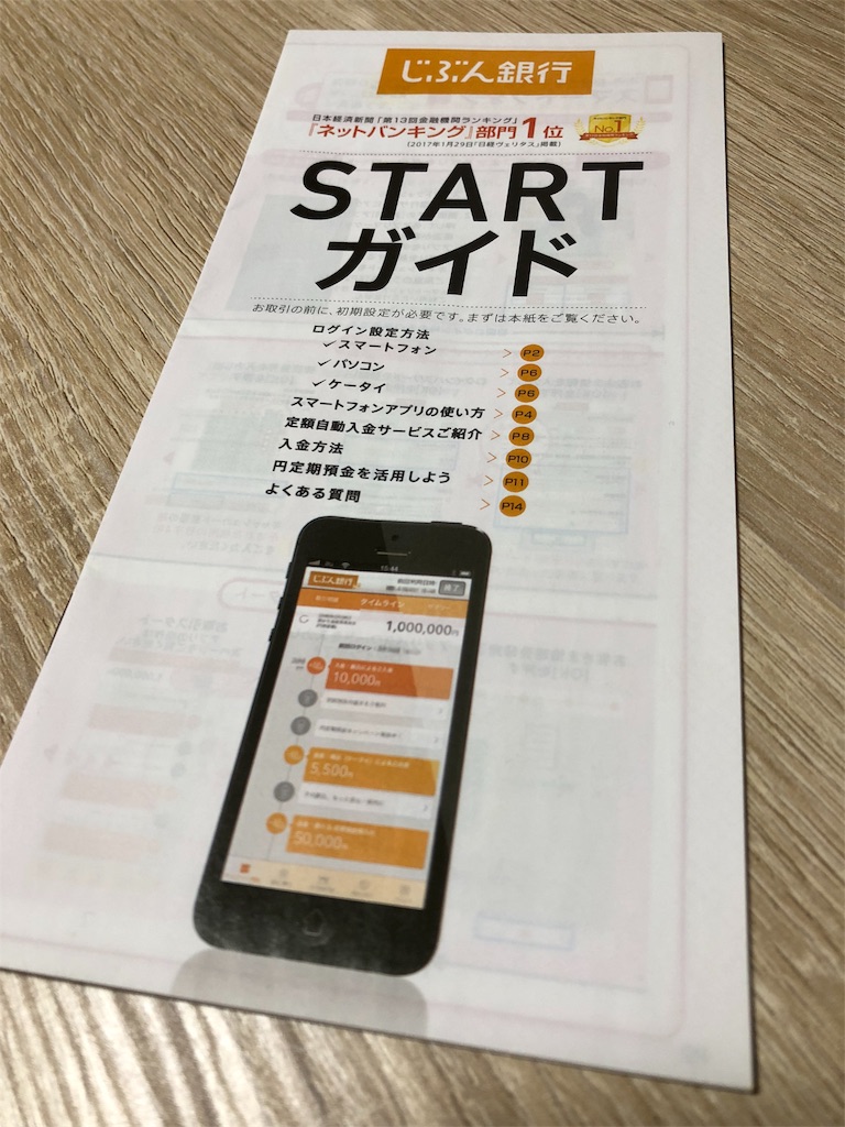キャッシュカードと一緒に送付されてきた「スタートガイド」に沿って、スマホアプリのダウンロード→初期設定と行いましょう。もちろんパソコンでも設定できます(こちらもスタートガイドに記載されています)